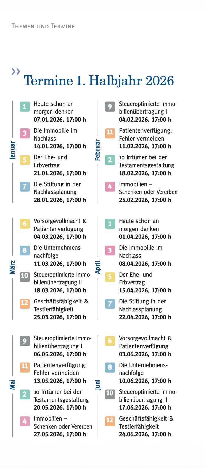 Diese Veranstaltungen sind dabei gezielt für juristische Laien konzipiert, dienen aber auch Fachleuten und Spezialisten aus den Gebieten Wirtschaft, Finanzen, Gesundheit und Medizin als Diskussionsforum.
