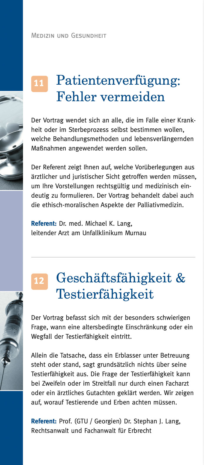 Im Rahmen der Messe „Die 66“ im April 2016 in München informierte die Kanzlei bei einem Vortrag über die häufigsten Fehler bei der Testamentsgestaltung und Vorsorgevollmacht.